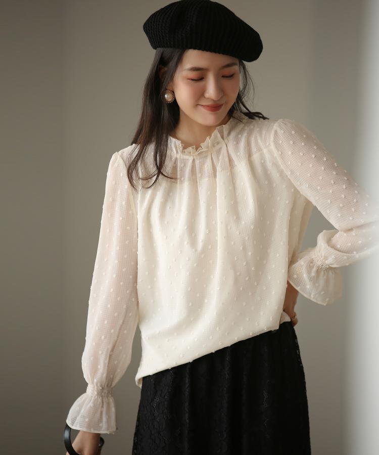 シアーな質感がセンシュアルなギャザーブラウス。透け感のある生地から覗く素肌が上品さを演出します。程よい透け感の生地に散りばめられたドットがフェミニンな雰囲気を後押し。主張しすぎない刺で大人女子にも使いやすいデザインです。首回りはギャザーを寄せたスタンドカラー。生地感たっぷりで首回りを可憐に飾ります。袖口にギャザーを寄せたふんわりスリーブはゆとりのあるシルエニットでさりげなく二の腕をカバー。フレアから覗く指先を美しく魅せるこだわりシルエニットです。