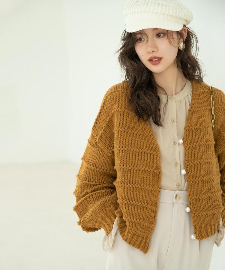 立体的なボーダー模様が引き立つローゲージのニットカーディガン。短めの着丈でコンパクトにまとめつつ、ゆったりと身幅のあるシルエットがガーリーなアイテム。手編みのようなざっくり感が楽しめるローゲージニットです。変則的なボーダー模様の編地で単調さを感じさせないデザインに。袖は肩のラインが落ちたドロップショルダーになっており、女性らしい柔らかな印象を与えます。袖口はリブ切り替えですっきりとしています。首回りは程よいゆとりのVネックでインナーとのレイヤードも自在。前立てには大ぶりなパールボタンがついてスタイル全体を高見えさせます。