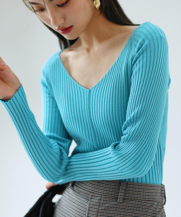 タイトなシルエットでこなれ感たっぷりに着こなすリブ編みのVネックニットプルオーバー。嵩張りにくくジャケットやワンピースとのレイヤードにもオススメです。フィット感のあるリブの編地がすっきりと細見せを叶えます。厚みがないのでコンパクトな見栄えです。首元はデコルテをきれいに見せてくれる広めのVネック。リブ切り替えなしなので、すっきりとした印象に。